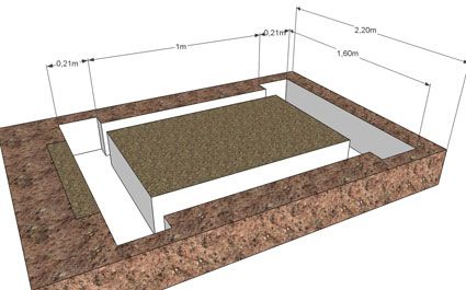 Далее по ширине штыковой лопаты –(это примерно 21 см) выкапывается траншея глубиной 25-30 см, как вы видите на схеме установка памятников и надгробий.
