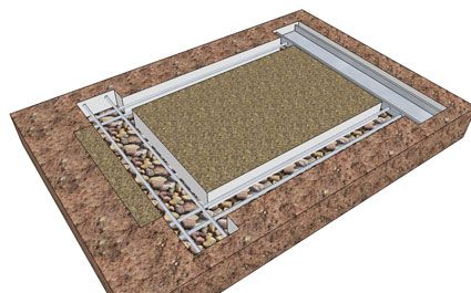 На пролитый щебень в то место, где будет по плану установлена подставка, следует уложить швеллер. В другие части траншеи укладываем арматуру согласно схеме. Все детали вязальной проволокой связываем между собой. Так мы образовали каркас. После этого следует залить эту конструкцию раствором, который должен быть густым, на два-три см ниже уровня грунта (то есть «нуля»). Делаем это для того, чтобы позднее «спрятать» бетон опорных точек под слоем земли.