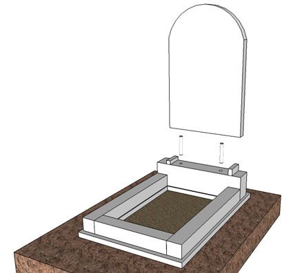 Поднимаем стелу и под углом опускаем ее плавно на деревянные бруски. Отверстие центрируем в стеле с арматурой. Когда арматура попадет в отверстие, приподняв медленно один край стелы, убираем деревянный брусок. Так же убираем и второй с другой стороны. Делать это следует аккуратно и медленно, чтобы не образовались сколы или иные повреждения кромки изделия. Далее стела устанавливается по уровню. Следует затереть швы в каждом месте стыков деталей.